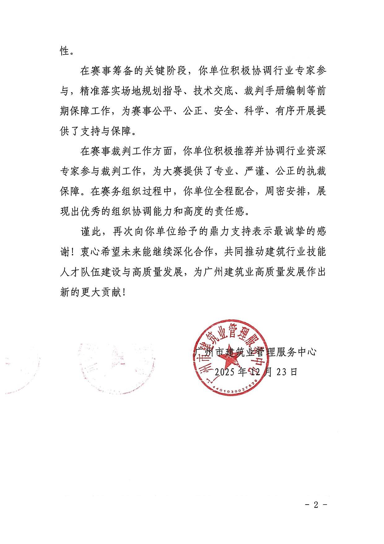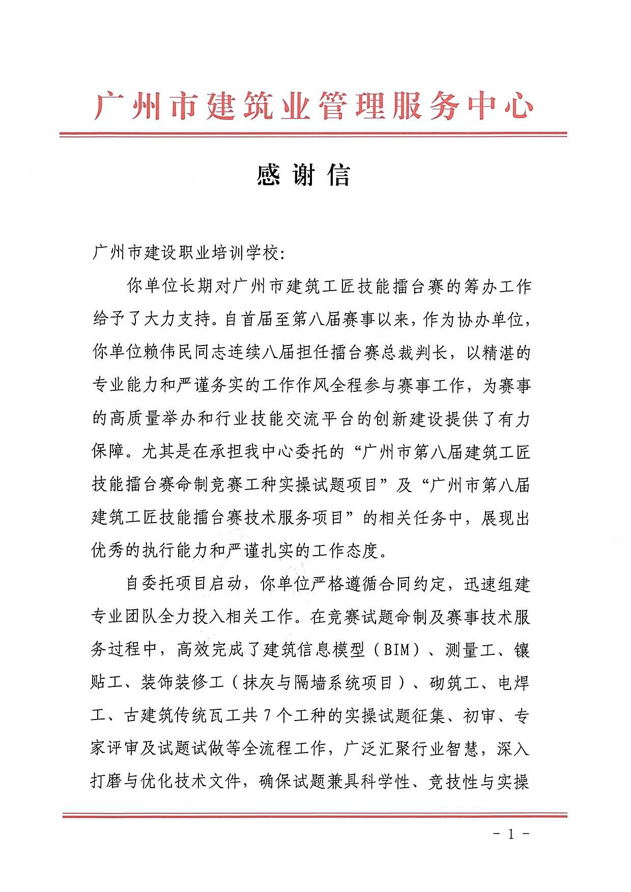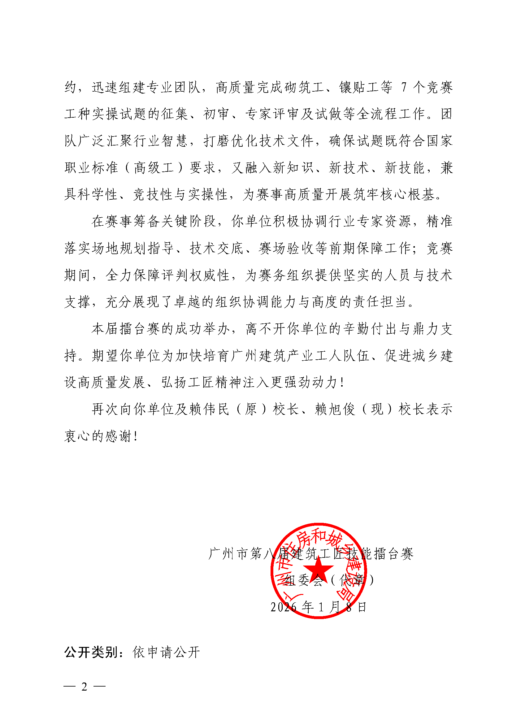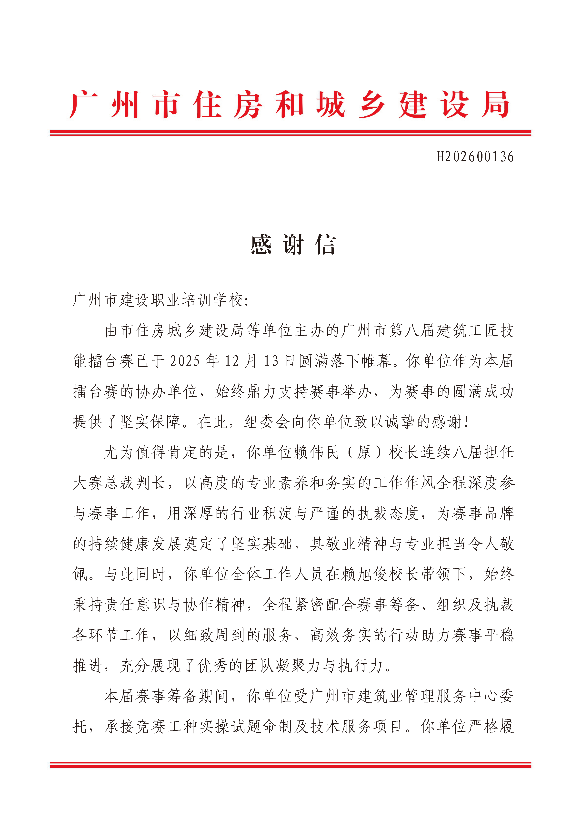 赖伟民同志更连续担任八届广州市建筑工匠技能擂台赛总裁判长。这届擂台赛学校全体员工在赖旭俊校长带领下,始终秉持责任意识与协作精神,全程紧密配合赛事筹备、组织及执裁各环节工作,以细致周到的服务、高效务实的行动助力赛事平稳推进,充分展现了优秀团队的凝聚力与执行力。学校荣获广州市住房和城乡建设局、广州市建筑业管理服务中心感谢信,多人次受到擂台赛组委会的表彰。