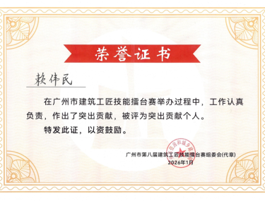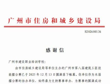 时间:2026-01-162025年12月13日,广州市第八届建筑工匠技能擂台赛在广州市城市建设职业学校三元里校区圆满落幕。本届赛事由广州市住房和城乡建设局、广州市总工会、广州市人力资源和社会保障局、白云区人民政府联合主办,广州市建筑业管理服务中心组织、广州市建筑集团有限公司承办,广州市建设职业培训学校等单位全程协办,吸引全...